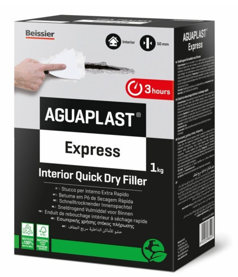 Beissier Aguaplast Express 1 kg este un glet interior cu uscare rapida, conceput pentru reparatii, umpleri adanci si nivelarea suprafetelor neuniforme. Produsul este potrivit pentru lucrari unde este nevoie de umplerea gaurilor, crapaturilor si orificiilor mari, de pana la 50 mm, fara contractare si fara crapare dupa uscare.